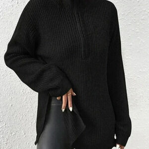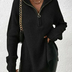 Black Casual Women's Half Zip Drop Shoulder Grain Sweater
