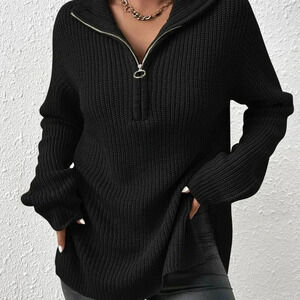 Black Casual Women's Half Zip Drop Shoulder Grain Sweater
