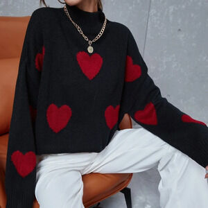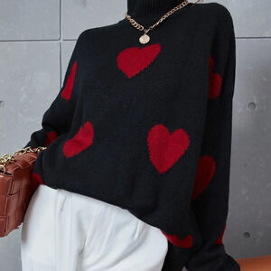 Black Casual Women's Heart Pattern Mock Neck Drop Shoulder Sweater