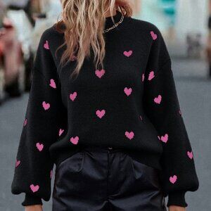 Black Casual Womens Heart Pattern Mock Neck Drop Shoulder Sweater