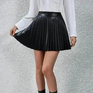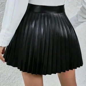 Black Casual Women's High Waisted Pleated Faux Leather Mini Skirt