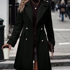 Black Casual Women's Lapel Neck Double Breasted Overcoat