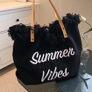 Black Casual Women's Large Capacity Fringed Canvas Tote Bag With Letter Design