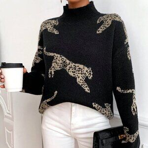 Black Casual Women's Leopard Pattern High Neck Drop Shoulder Sweater