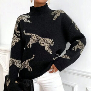 Black Casual Women's Leopard Pattern High Neck Drop Shoulder Sweater