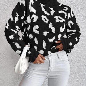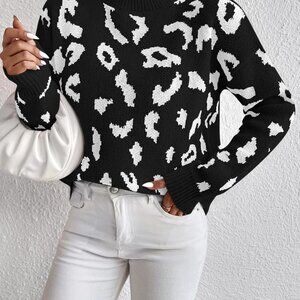 Black Casual Womens Leopard Pattern Mock Neck Drop Shoulder Sweater