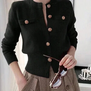 Black Casual Women's Long Sleeve Knit Ribbed Button Round Neck Cardigan