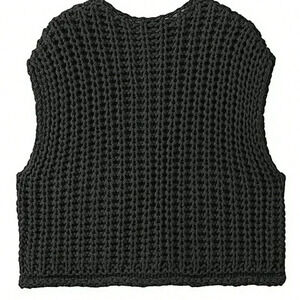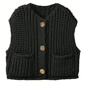 Black Casual Women's Loose Knit Vest With Double Pockets