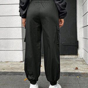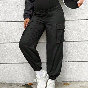 Black Casual Womens Maternity Flap Pocket Side Adjustable Waist Cargo Pants
