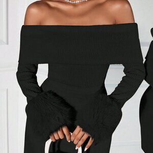 Black Casual Women's Patchwork Furry Cuff Off Shoulder Fitted Blouse