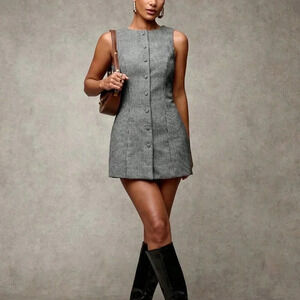 Black Casual Women's Plaid Round Neck Sleeveless Button Front Mini Dress