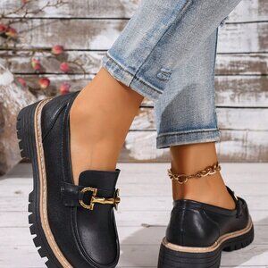 Elevate your casual style with these black platform loafers, featuring a sleek metal chain detail. Designed for women, these loafers combine comfort and fashion, making them perfect for everyday wear.