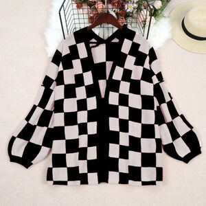 Black Casual Women's Plus Size Plaid Round Neck Long Sleeve Knit Cardigan