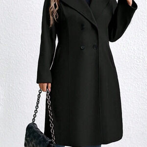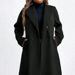 Black Casual Women's Plus Size Plain Double Breasted Pocket Long Sleeve Overcoat