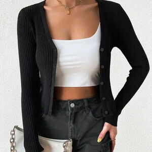 Black Casual Women's Ribbed Knit Button Front Cardigan