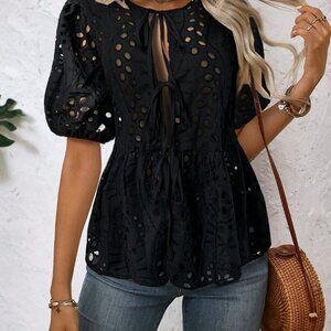 Black Casual Women's Round Neck Short Sleeve Shirt Peplum Top