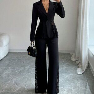 Black Casual Women's Single-Breasted Lace Patchwork Blazer & Pants Suit Set