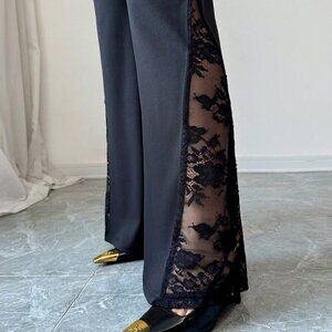 Black Casual Women's Single-Breasted Lace Patchwork Blazer & Pants Suit Set