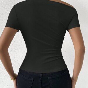 Black Casual Women's Solid Asymmetrical Neck Ruched Tee