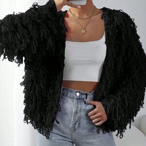 Black Casual Women's Solid Color Coil Knitted Cardigan