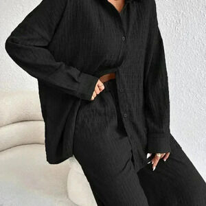 Black Casual Women's Solid Drop Shoulder Shirt & Wide Leg Pants