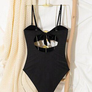 Black Casual Women's Solid Hollow Out Metal Decor Jumpsuit