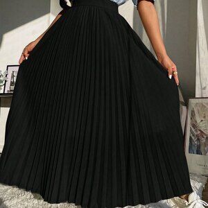 Black Casual Women's Solid Pleated Longline Skirt