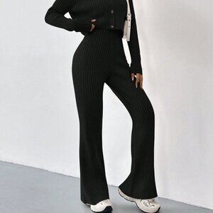 Black Casual Women's Summer Ribbed Knit Cardigan & Flare Leg Knit Pants set
