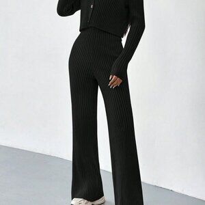 Black Casual Women's Summer Ribbed Knit Cardigan & Flare Leg Knit Pants set