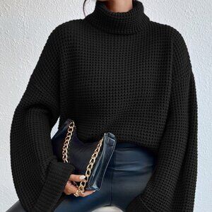 Black Casual Womens Turtleneck Drop Shoulder Waffle Knit Sweater