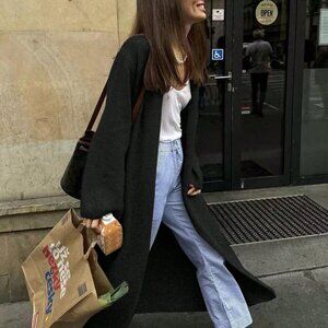 Black Casual Women's V-Neck Buttonless Super Loose Long-Sleeved Knitted Cardigan