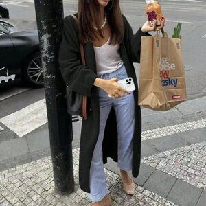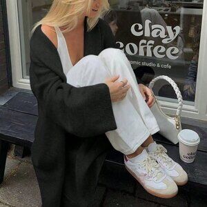 Black Casual Women's V-Neck Buttonless Super Loose Long-Sleeved Knitted Cardigan