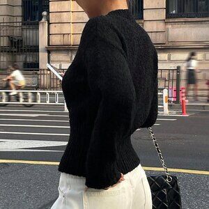 Black Casual Women's V-Neck Rose Button-Up knit sweater Cardigan