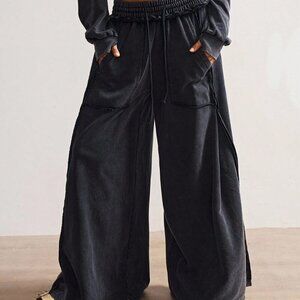 Black Casual Women's Washed Knit Long Sleeve Loose Backless Sweatshirt & pants