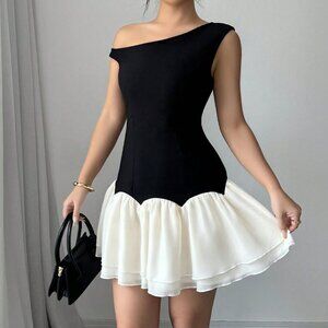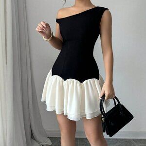 Black Casual Women's Woven Splicing Design Sleeveless Asymmetric Mini Dress