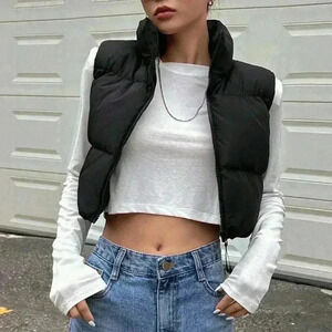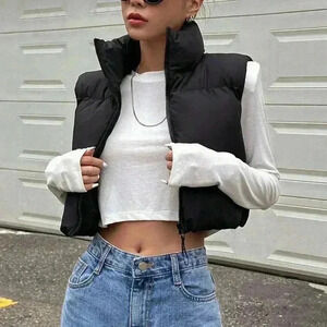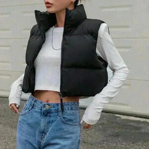 Black Casual Women's Zip Up Crop Vest Puffer Thick Coat