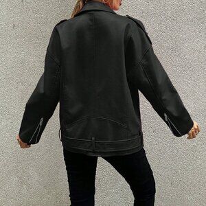 Black Casual Women's Zip Up Flap Detail Belted Moto Jacket