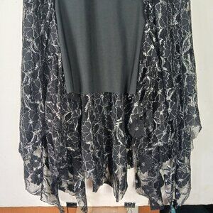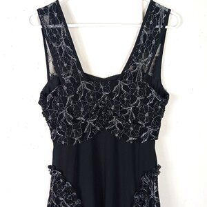 • Details: Lace Overlay, Metallic Silver Accents, Handkerchief Hem, Sleeveless, Zip Back