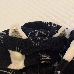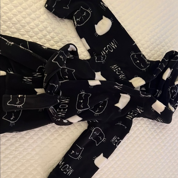 Cozy black robe with cute cat print and 'Meow' text. Perfect for lounging.