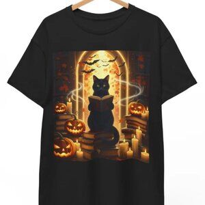 Black Cat Reading Books Pumpkin Autumn Teachers Halloween Unisex T-shirt