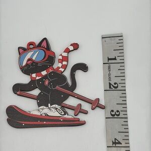 Add a playful touch to your Christmas tree with this adorable black cat skiing ornament! Features a cool kitty in red ski goggles and a striped scarf, racing down the slopes. Made from lightweight wood-like material. Measures approx. 4.5” tall and includes 3 hanging options: red satin ribbon, gold metallic cord, and jute twine. Purr-fect for cat lovers and winter enthusiasts!