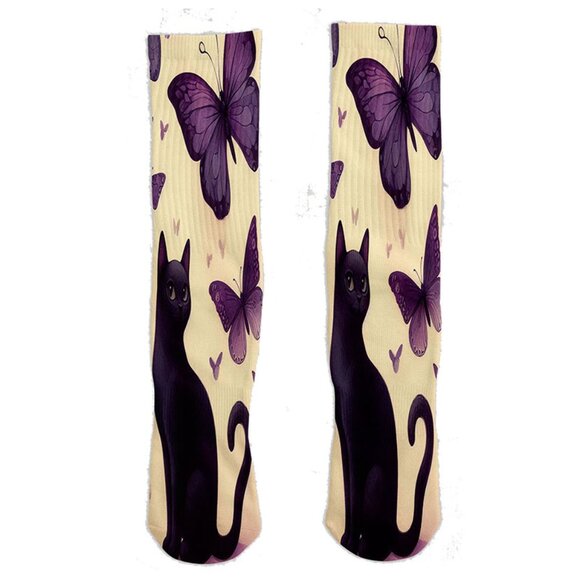 Black Cat with Beautiful Butterflies Sublimated 360 Adult Crew Socks