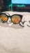 Stylish black cat-eye sunglasses with reflective gold lenses. Perfect for a chic look.
