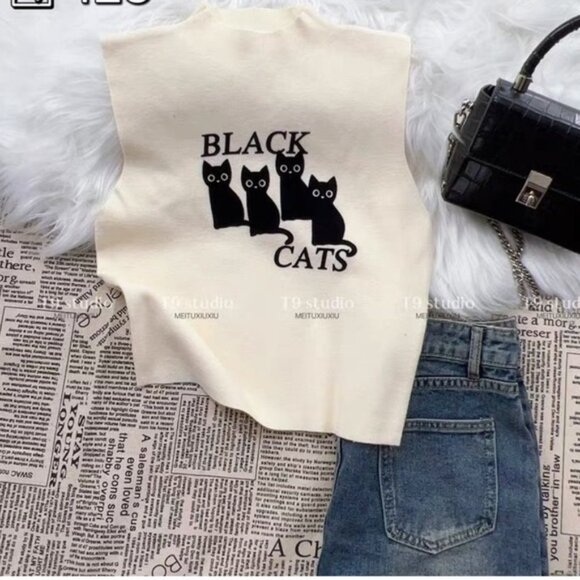 Black Cats Mock Neck Sleeveless Sweater Cream