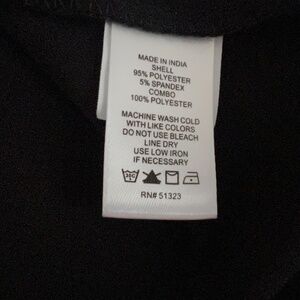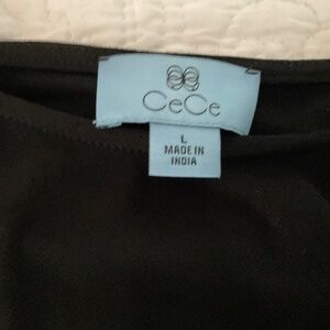 Black CeCe top with 3/4 sleeves. The sleeve material is slightly see through which dresses it up a bit. This would be good for dressing up or down. The size is large and sits at the hip area.
