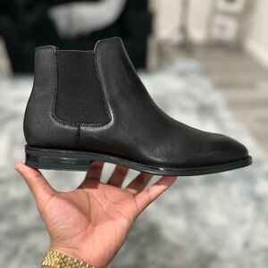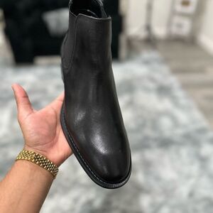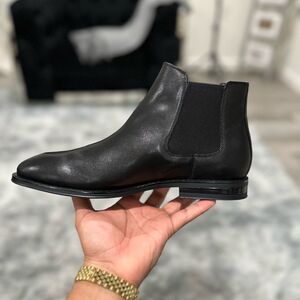 Aldo Chelsea boots feature a sleek smooth leather finish and elastic side panels for easy wear. The ankle-high design and low stacked heel provide both comfort and style, making them a versatile addition to any wardrobe. No Box