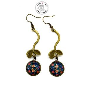 Our adorable Black Cherry Dangle Earrings are sure to stand out with their long bronze stems with tiny leaves and multicolored berry bottoms. This statement pair features 14mm Photo Glass Cabochons with a Multicolored Black Floral Design. This unique jewelry pair will stay snug in your ears with our nickel free, brass ear wires with rubber backings. Flaunt your carefree & fun side in these super cute Black Cherry Dangle Earrings!