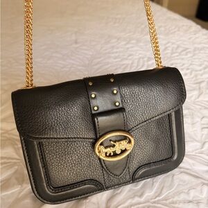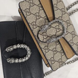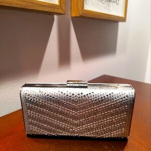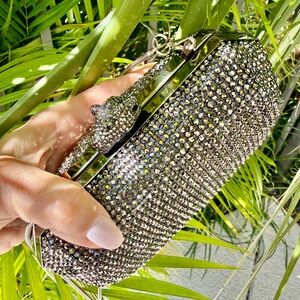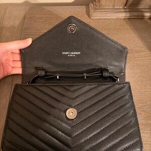 Chic black chevron design. Iconic YSL logo in silver. Perfect for evening elegance.