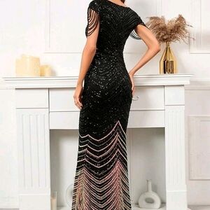 Black Chevron Print, Deep V Neck, Contrast Sequined and Contrast Mesh, Cap Sleeve, Mermaid Maxi Gown for Special Events