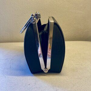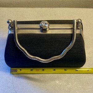 Black hard-shell purse with silver accents and large rhinestone clasp.